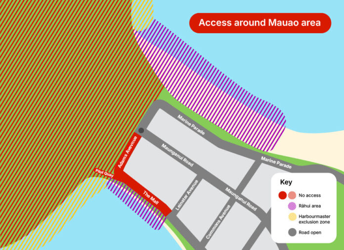 A 30-metre maritime exclusion zone also remains in place around Mauao. The exclusion applies to all vessels and people, including swimmers, and extends 30 metres from the base and shoreline of Mauao.